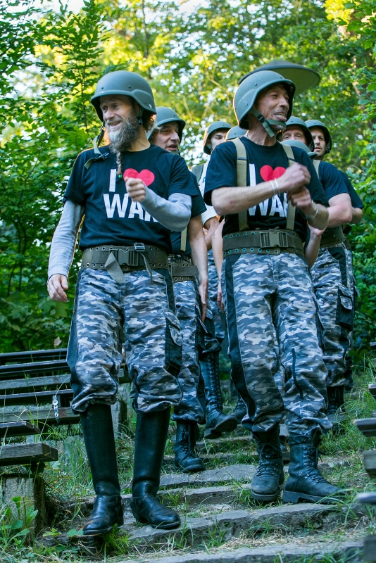Das Gefangenentheater aufBruch in Berlin hat mit Brechts „Mann ist Mann“ eine schrille Komödie zum aktuellen Mobilmachungsdiskurs inszeniert