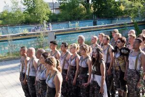 ...nicht nur das Ensemble, auch der Ort, an dem es spielt, ist ungewöhnlich – und in seiner Verwunschenheit allemal eine Reise ins tiefste Berlin-Lichtenberg wert. Zwei alte, riesige Schwimmbecken mit rostigen Sprungtürmen, überwachsen von Birken und Trauerweiden, umgeben von Bäumen und weitläufigen Sportplätzen. Die ehemalige Trainingsanlage der Nationalsozialisten ist heute ein vergessener Ort, den Regisseur Peter Atanassow wiederentdeckt hat.