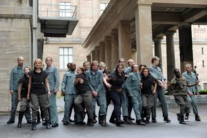 Hier - bzw. vor den Mauern Trojas - stehen sich unvereinbar die Heere der Amazonen und der Griechen gegenüber, exemplarisch verkörpert durch einen Frauen- und einen Männerchor. Die einzige Verbindung beider Gruppen, die als Kriegskollektiv voneinander abhängig sind, sind die beiden Liebenden, Penthesilea und Achill. Durch sie geht der Riss, der den antiken Chor entzweit. Dieser Riss findet sich in dem für aufBruch typischen vielköpfigen Ensemble unterschiedlichster sozialer Herkunft und Nationalität ebenso wieder wie in den Bevölkerungsgruppen und Menschenmassen, die tagtäglich durch Berlins Mitte strömen.