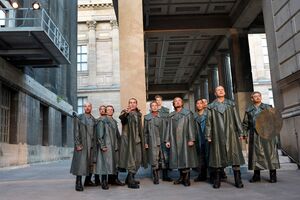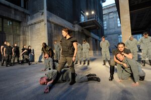 Atanassow arbeitet ausgezeichnet mit dem Areal, das eine gute Akustik bietet. Er verzichtet auf weitere Kulisse. Auf der leicht ansteigenden Auffahrt zwischen den Häusern und in den Kolonnaden lässt er die Heere parallel aufmarschieren. Dort und davor gehen sie aufeinander los oder ziehen aneinander vorbei. Valerie Kroener schuf dafür eine eindrucksvolle Choreografie. (Neues Deutschland, zum Artikel)