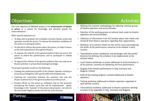 The general objective of the project is to strengthen and improve through learning and through the exchange of knowledge the capacities of all those cultural operators who perform and realize theatre activities in prison.