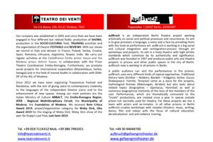 Free man walking – theatre as a tool for detainees' integration is a European Project that has Teatro dei Venti as leader partner and aufBruch (Germany), Fundacja Jubilo (Poland) and UPSDA (Bulgaria) as partners. The four organizations share the problems and needs related to the art of practising theatre in prison with prisoners and aim to improve the effectiveness, feasibility and sustainability of theatre work in prisons, as a means of social and personal rehabilitation for detainees.