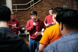 E.: Die Rollenspiele, das habe ich noch nie vorher gemacht. Dann das Einsprechen, habe ich auch vorher noch nie gemacht, etwas für die Stimme zu tun. In so einer großen Gruppe habe ich auch noch nie gearbeitet. Manchmal, wenn es laut ist, ist es schwer. Man lenkt sich ab. Aber im Endeffekt klappt es auch.